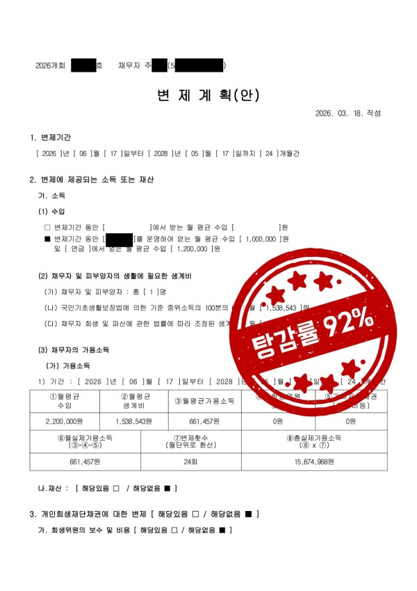 개인회생 탕감률 92%